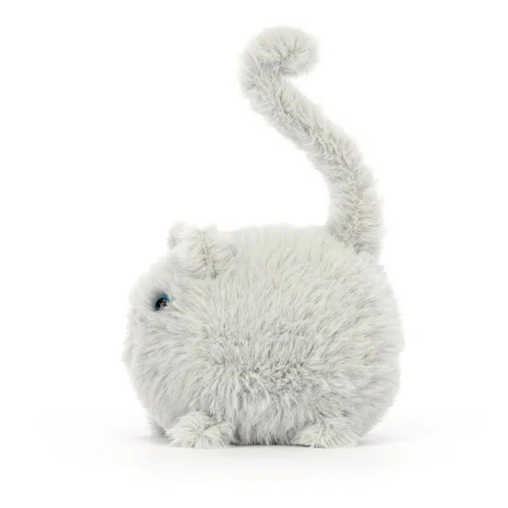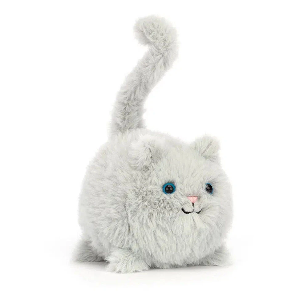 Caboodle Kitten from Jellycat features grey coloured fur which is incredibly soft and strokable. She has a round body, curling tail that’s pricked upright, sticky-up, wide piercing blue eyes, and a stitched pink nose. She is waiting for you to take her on a wonderful playtime adventure, and for lots of cuddles at naptime.