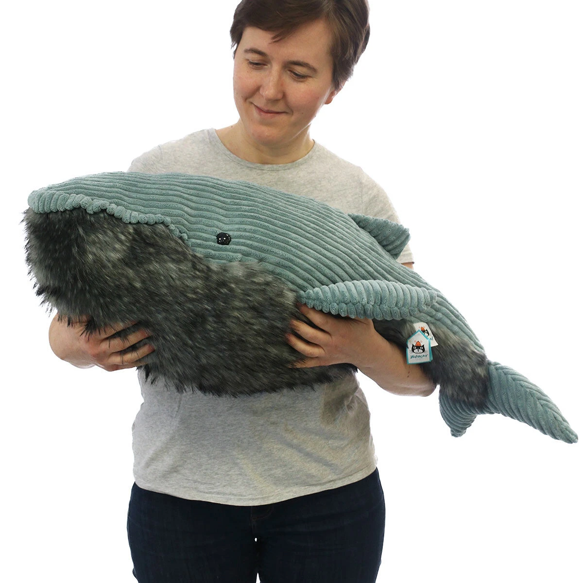 Wiley Whale features a grey blue corduroy back with matching tail fin and flippers. This large blue whale has a super fluffy grey chin and tummy!