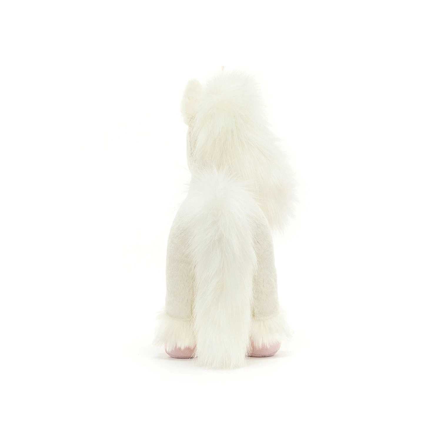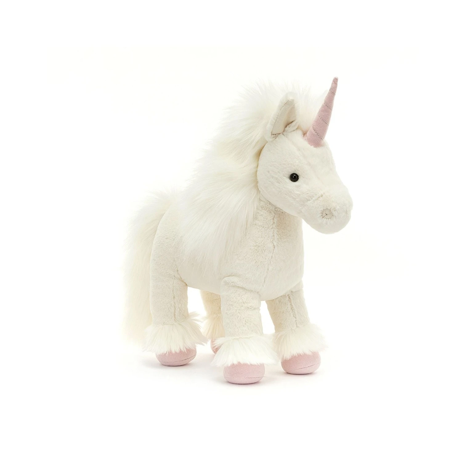 A dreamy sight in clotted-cream fur, Isadora Unicorn is enchanting. With a plume mane and tail, silky feather and a pink twist horn stitched with silver, she trots through the forest on blush suedette hooves!