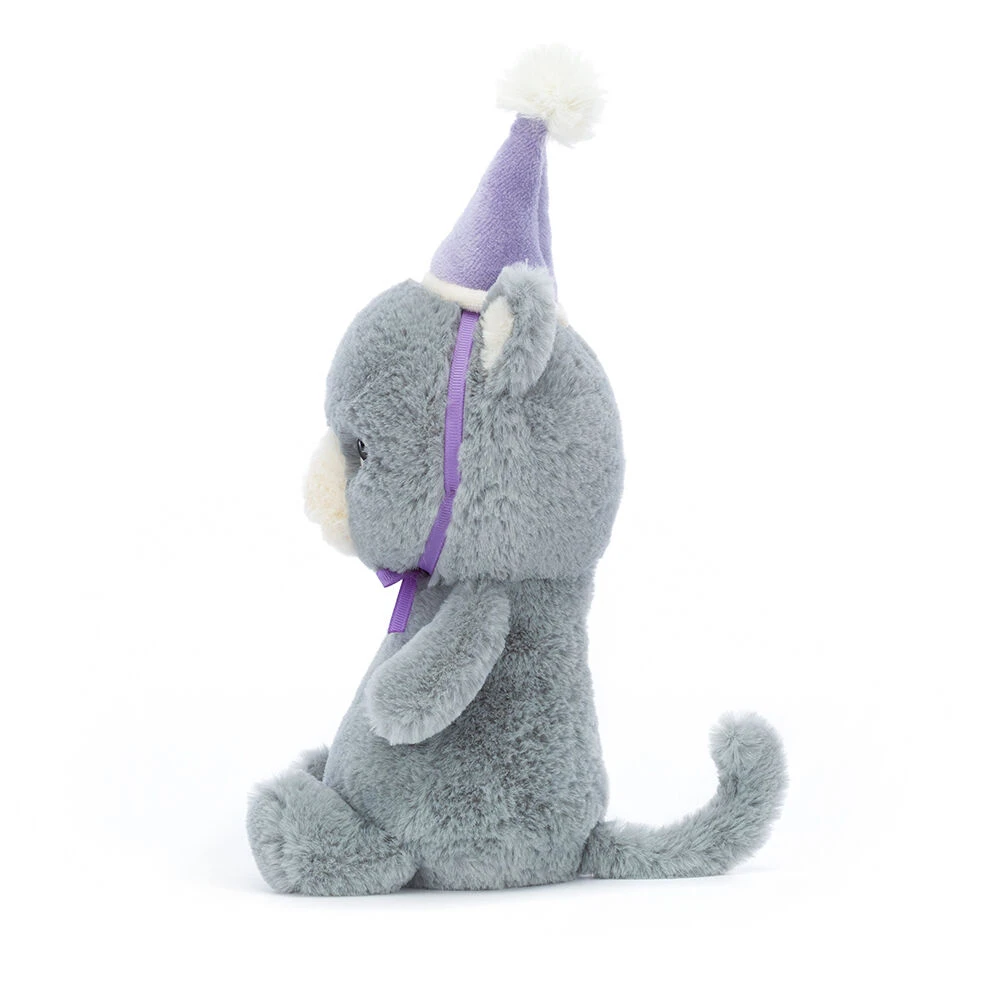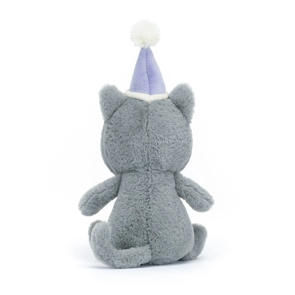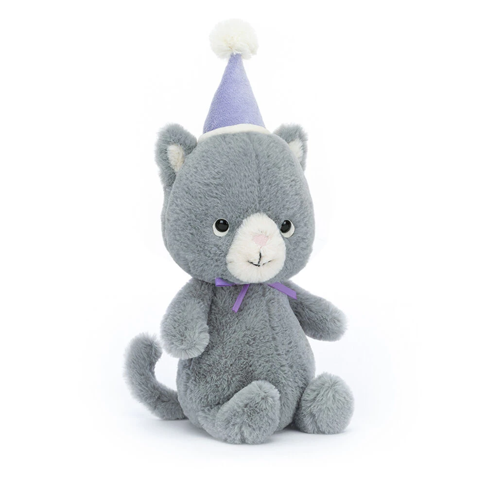 This adorable kitty is called Jollipop Cat! She is charming and endearing, and she’s sure to become a firm favourite in your cuddly collection. Coloured in grey fur with a white snout, her cute face and adorable charm are sure to bring an instant smile to your face. The best thing about her is that she wears a blue party hat and a ribbon bow tie so she’s always ready to party!