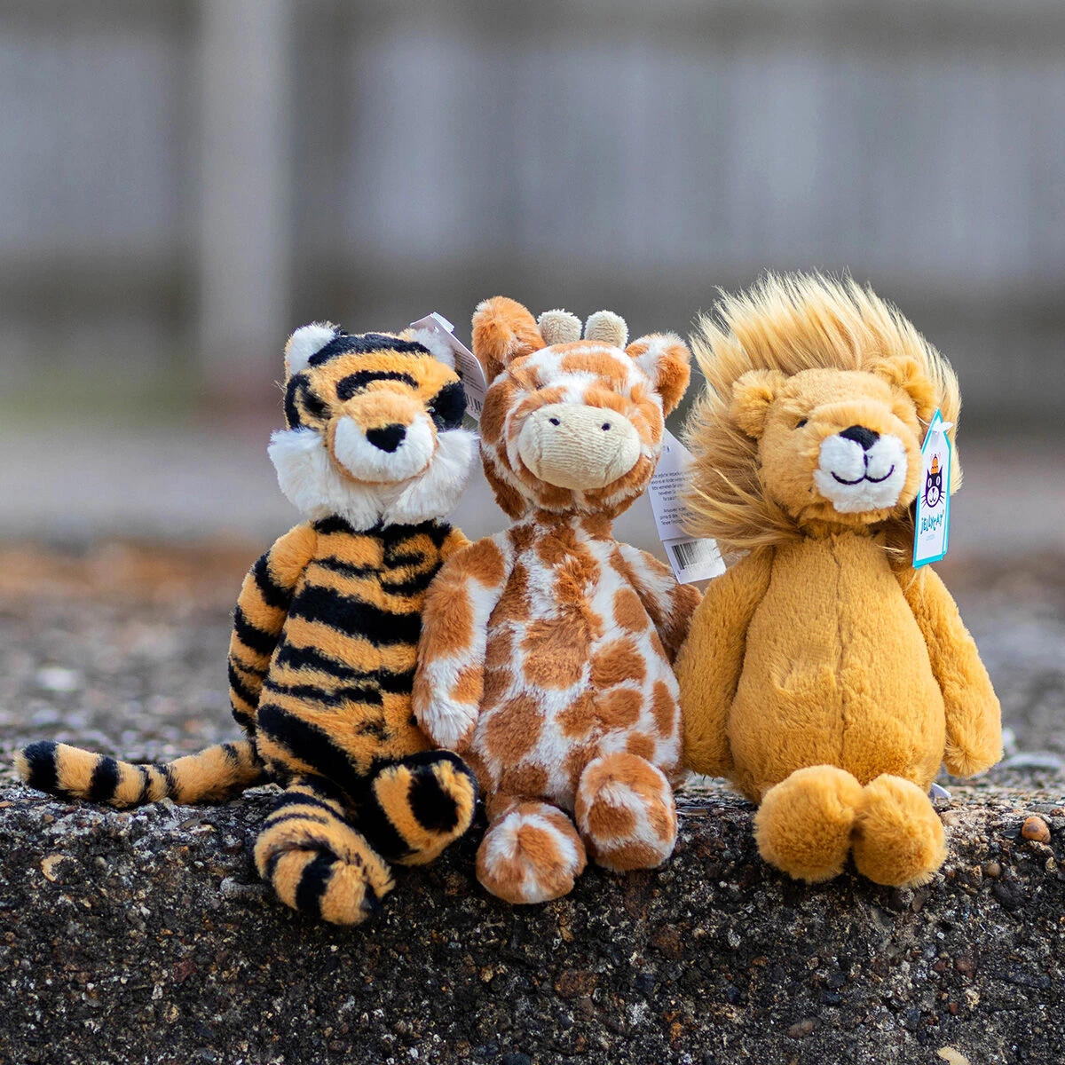 This handsome little fella is Bashful Tiger, and he loves to dash about flaunting his black and orange stripes. He is the perfect companion for all your jungle adventures. This soft and cuddly tiger from Jellycat has super soft, stripy fur and a velvety nose. He has a well-rounded tummy and has white furry whiskers by his snout.